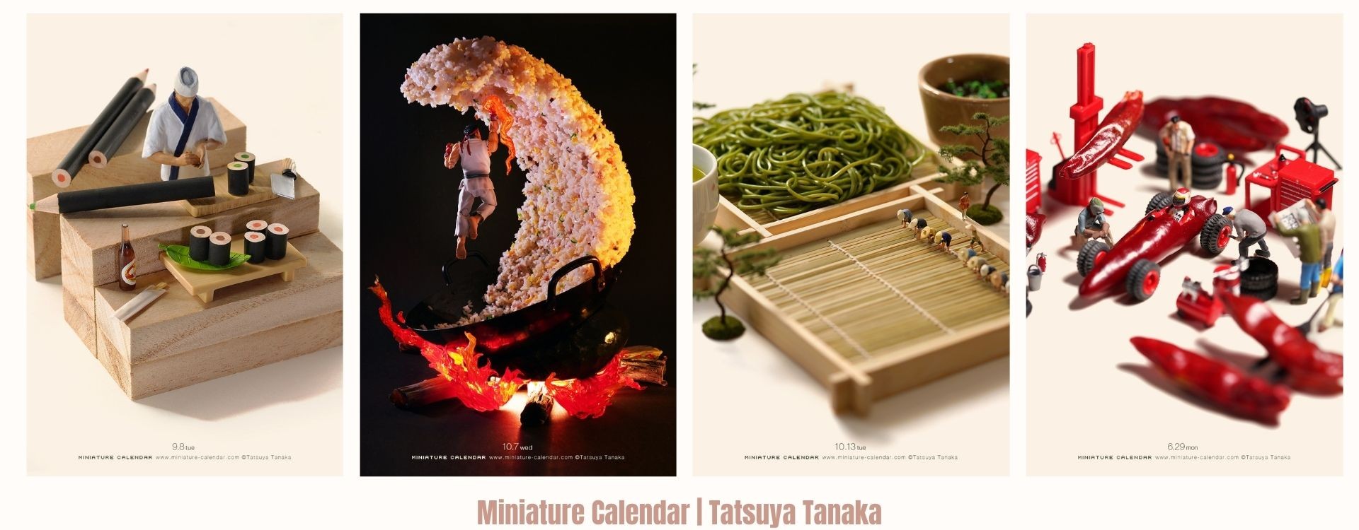 Miniature Calendar racconta la vita con piccoli diorami realizzati con oggetti quotidiani. Una spazzola diventa risaia, riccioli di wasabi diventano tetti di casette, un broccolo diventa albero della savana. Canguri saltano su montagne fatte di pane in cassetta.