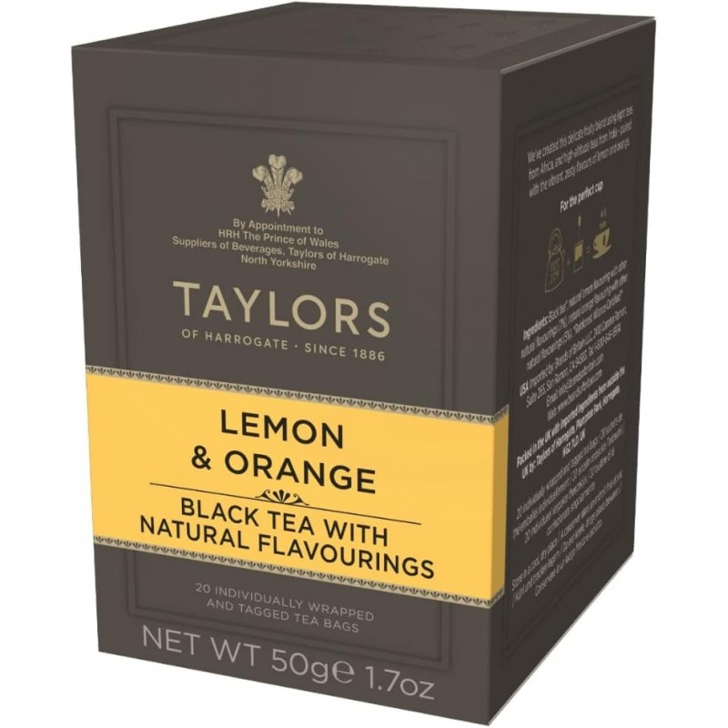 Tè nero Taylors con aromi naturali di limone e arancia. 20 filtri da 2,5 g; infusione 4–5 minuti. Fresco, agrumato. Consegne rapide 24/48 ore.