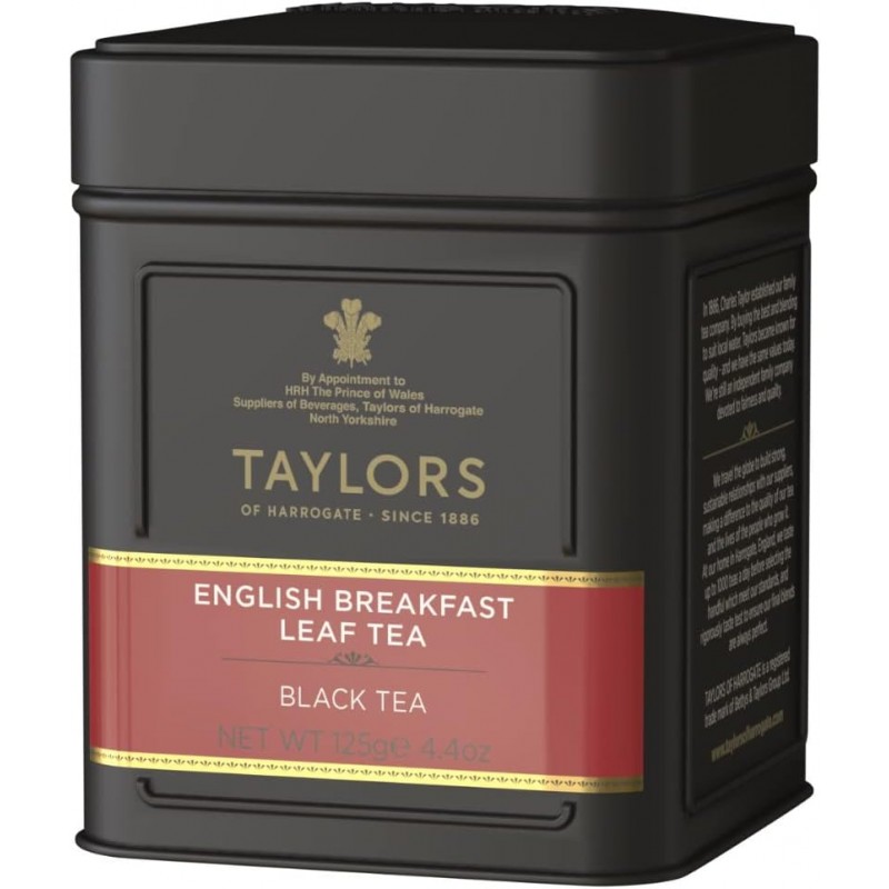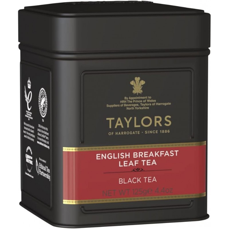 Tè Nero English Breakfast Taylors of Harrogate 125?g: miscela di foglie pregiate Assam, Ceylon e Africa con golden tips, gusto maltato e corpo intenso.