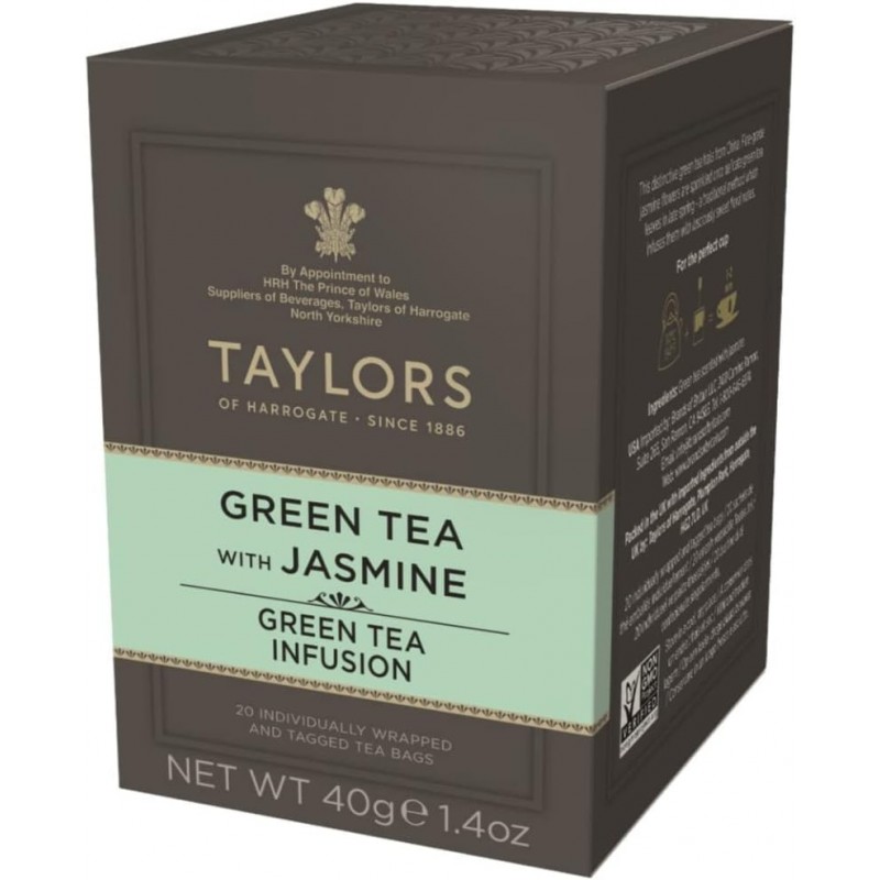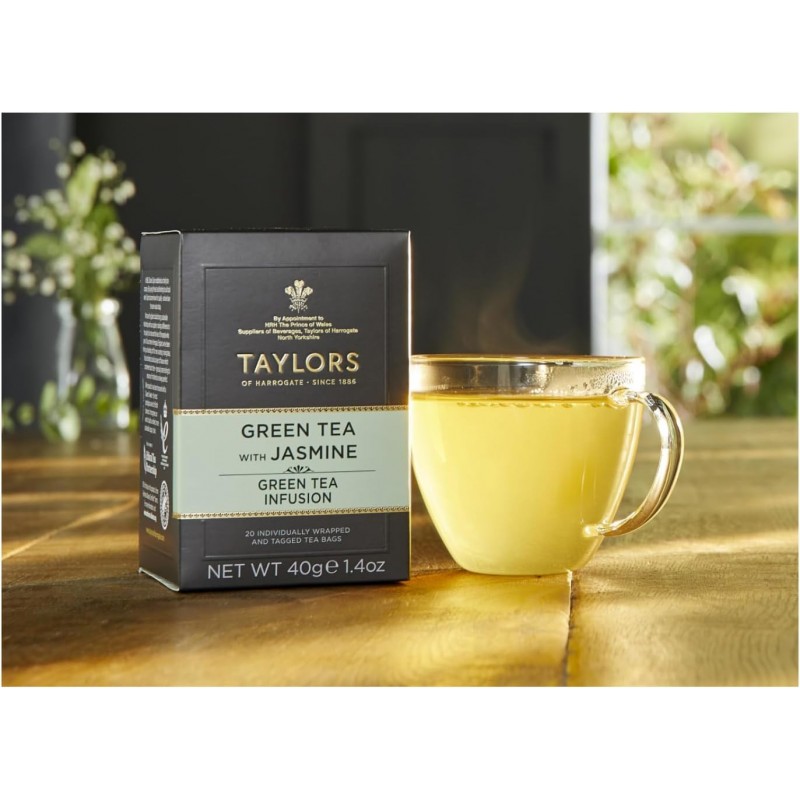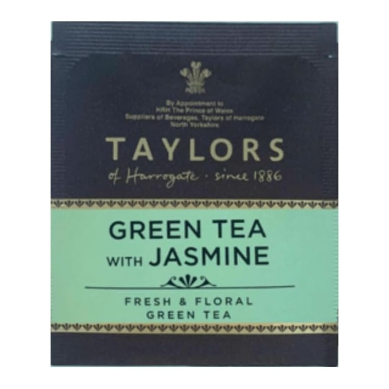 Scopri il tè verde Jasmine Taylors of Harrogate : fiori di gelsomino freschi infusi su tè verde di alta qualità per un gusto leggero, floreale e rinfrescante.
