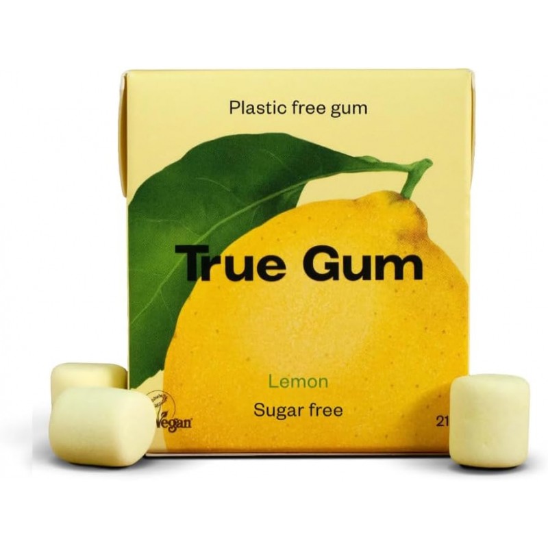 Chewingums al limone True Gum, senza zucchero e plastic free, gusto fresco e agrumato. Ideali per una pausa rinfrescante in ogni momento.