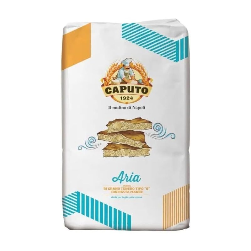 Aria è la nuova farina Caputo prodotta sempre e solo dal grano realizzato con pasta madre, ideale per la preparazione di gustose pizze in teglia, alla pala e pinse: garantisce impasti ad alta idratazione leggeri, croccanti e di facile manipolazione.