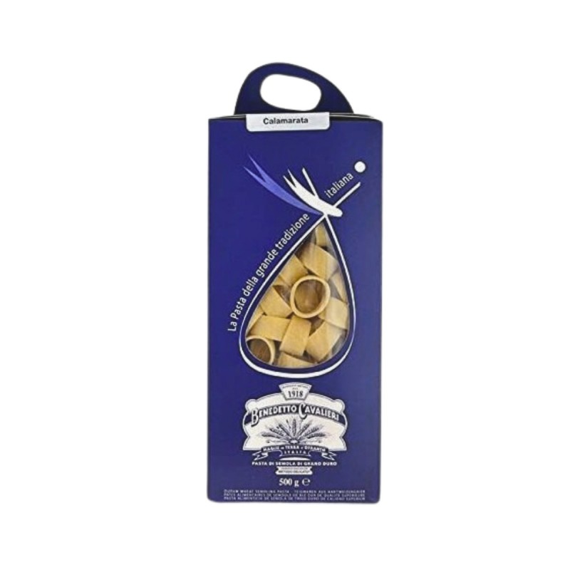 La calamarata Benedetto Cavalieri è uno dei tipi di pasta di grano duro appartenente alla famiglia dei paccheri. Ottima coi frutti di mare, oppure unita al ragù o ancora condita con salsa di pomodoro e servita con abbondante parmigiano grattugiato o pecorino di fossa stagionato. Più nello specifico la calamarata è una via di mezzo tra le mezze maniche e i paccheri e sono uno dei formati di pasta artigianle prodotti dal Pastificio Benedetto Cavalieri.