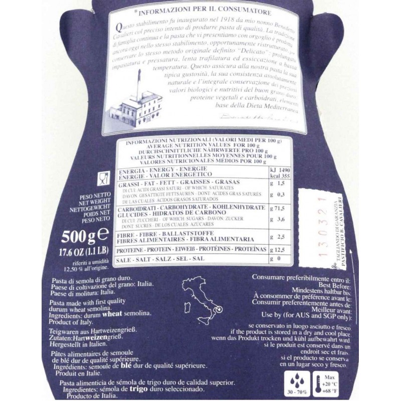 Il Pastificio Benedetto Cavalieri produce pasta di semola di grano duro fin dal 1918. La pasta viene prodotta con una selezione dei migliori grani che crescono in terreni specifici, soprattutto sulle colline di Puglia e Basilicata. Il metodo di lavorazione viene definito “Metodo Delicato”, consiste in una prolungata impastatura, una lenta gramolatura, una pressatura e trafilatura al bronzo ed una essiccazione a bassa temperatura. Tutto ciò rende la pasta in grado di custodire il suo sapore tipico, assicurare una consistenza più che naturale e mantenere in modo ottimale tutti i condimenti.