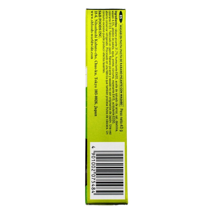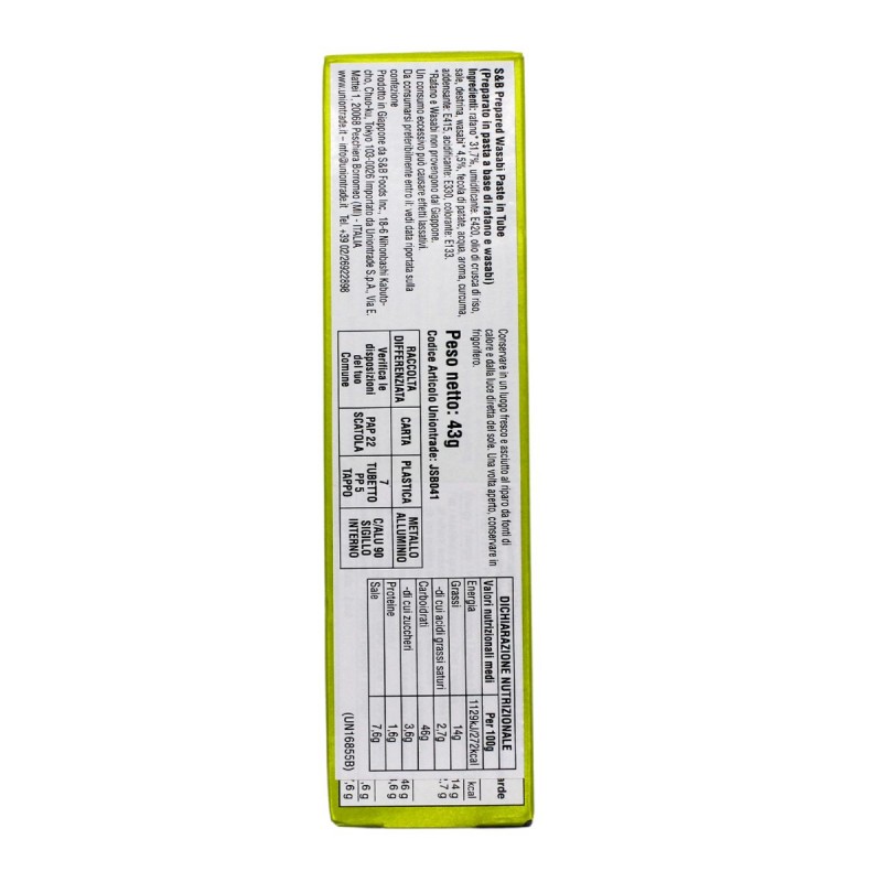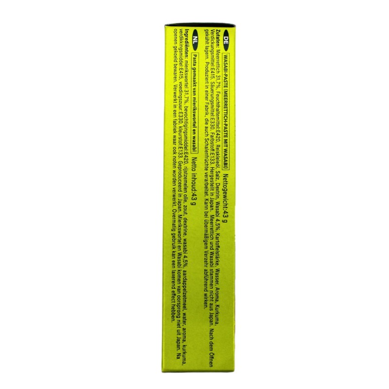 Ingredienti: Rafano (31.7%), Wasabi Giapponese (4.5%), Curcuma, Olio di Crusca di Riso, Acqua, Sale, Amido di Patata, Destrina, Aromi (contiene Olio di Senape), Emulsionante: E420, Addensante: E415, Regolatore di acidità: E330, Coloranti alimentari: E100-E133.