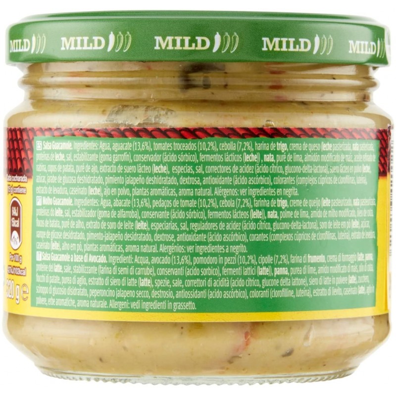 Ingredienti: acqua, avocado, pomodoro in pezzi, cipolle, farina di frumento, crema di formaggio (latte, panna, proteine del latte, sale, stabilizzante (farine di semi di carrube), conservante E200, fermenti lattici (latte), panna, purea di lime, amido modificato di mais, olio di colza, fiocchi di patate, purea di aglio, estratti del siero del latte, spezie, sale, correttore di acidità E330, gluocne delta lattone, siero di latte in polvere, zucchero, sciroppo di glucosio disidratato, peperoncino jalapeno secco, destrosio, antiossidante E300, colorante E141-E161b, estratto di lievito, caseinato ( ), aglio in polvere, erbe aromatiche, aroma naturale.